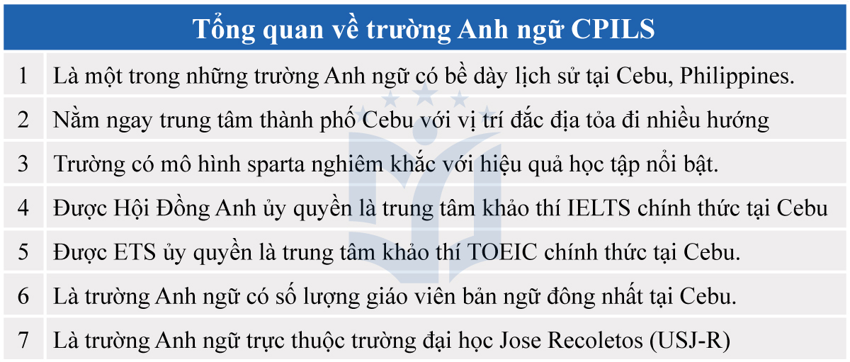 CPILS là một trong những trường Anh ngữ có bề dày lịch sử lâu đời bậc nhất tại thành phố Cebu - Philippines. Xuyên suốt hơn 2 thập niên giảng dạy và đào tạo, đã có hơn 60.000 học viên quốc tế tốt nghiệp tại CPILS, đây là một thành tích mà rất hiếm trường Anh ngữ nào tại Philippines có thể đạt được.