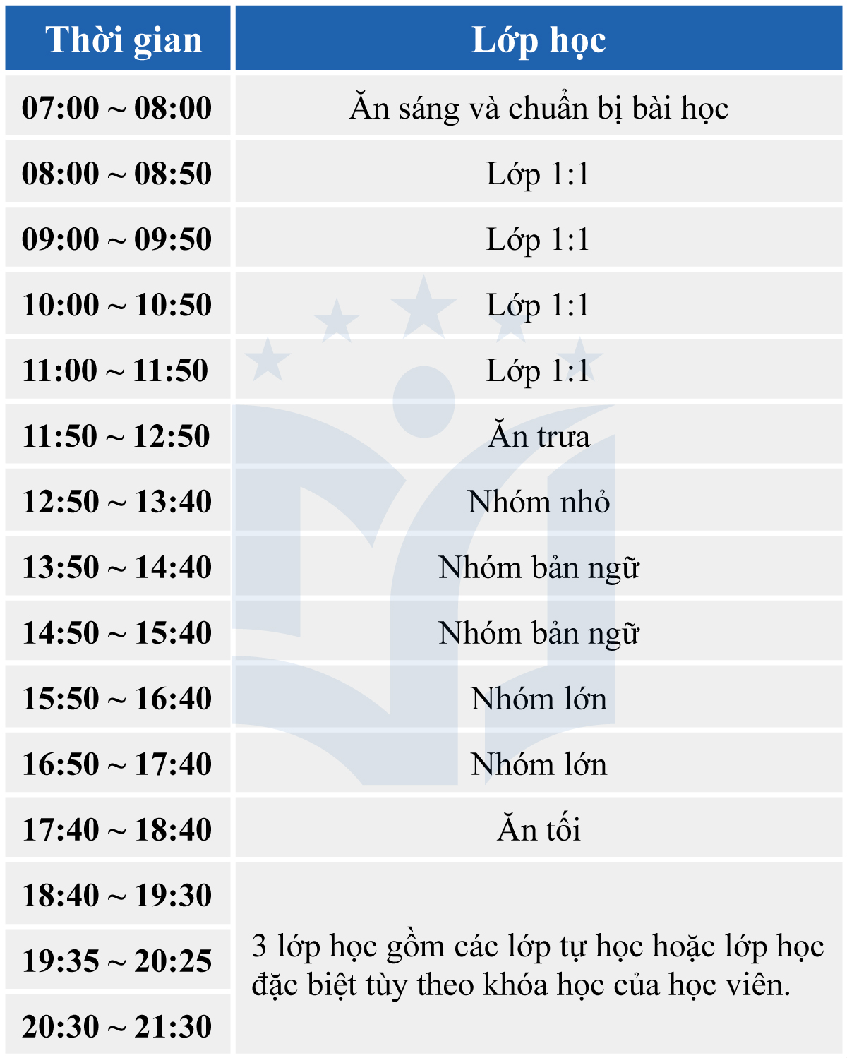 - Riêng vào thứ 6 hàng tuần, thời gian học của mỗi lớp học sẽ chỉ còn 40 phút, và các lớp học sẽ kết thúc vào 15:20 chiều. Ngoại trừ khóa IELTS vẫn sẽ diễn ra như bình thường đến hết chiều thứ sáu.