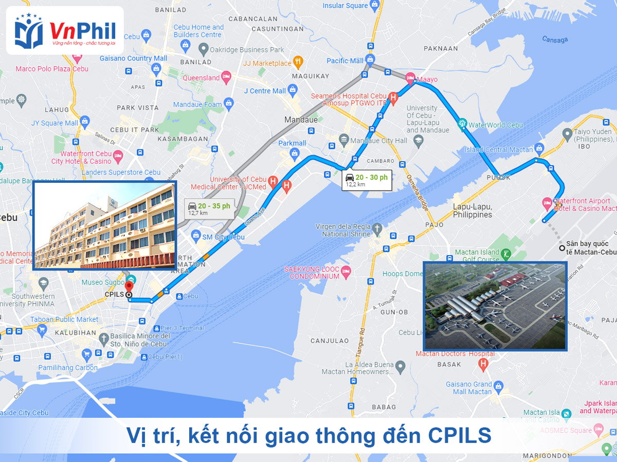Trường anh Ngữ CPILS (viết tắt của Center for Premier International Language Studies) nằm trên mặt tiền đường M.J. Cuenco Ave, cách sân bay quốc tế Mactan-Cebu khoảng 30 phút di chuyển bằng xe ô tô. Liền kề với khu vực sầm uất bậc nhất Cebu. Kế bên trường có cửa hàng tiện lợi Seven Eleven cùng các cửa hàng nhỏ lẻ khác. Chỉ mất 5 đến 10 phút di chuyển bằng taxi là bạn có thể đến được trung tâm mua sắm lớn nhất Cebu như Ayala, SM City… Đây cũng là đầu mối giao thông, nên việc di chuyển đến các địa điểm khác tại Cebu cũng rất dễ dàng hoặc đến bến tàu để đi đến Bohol…