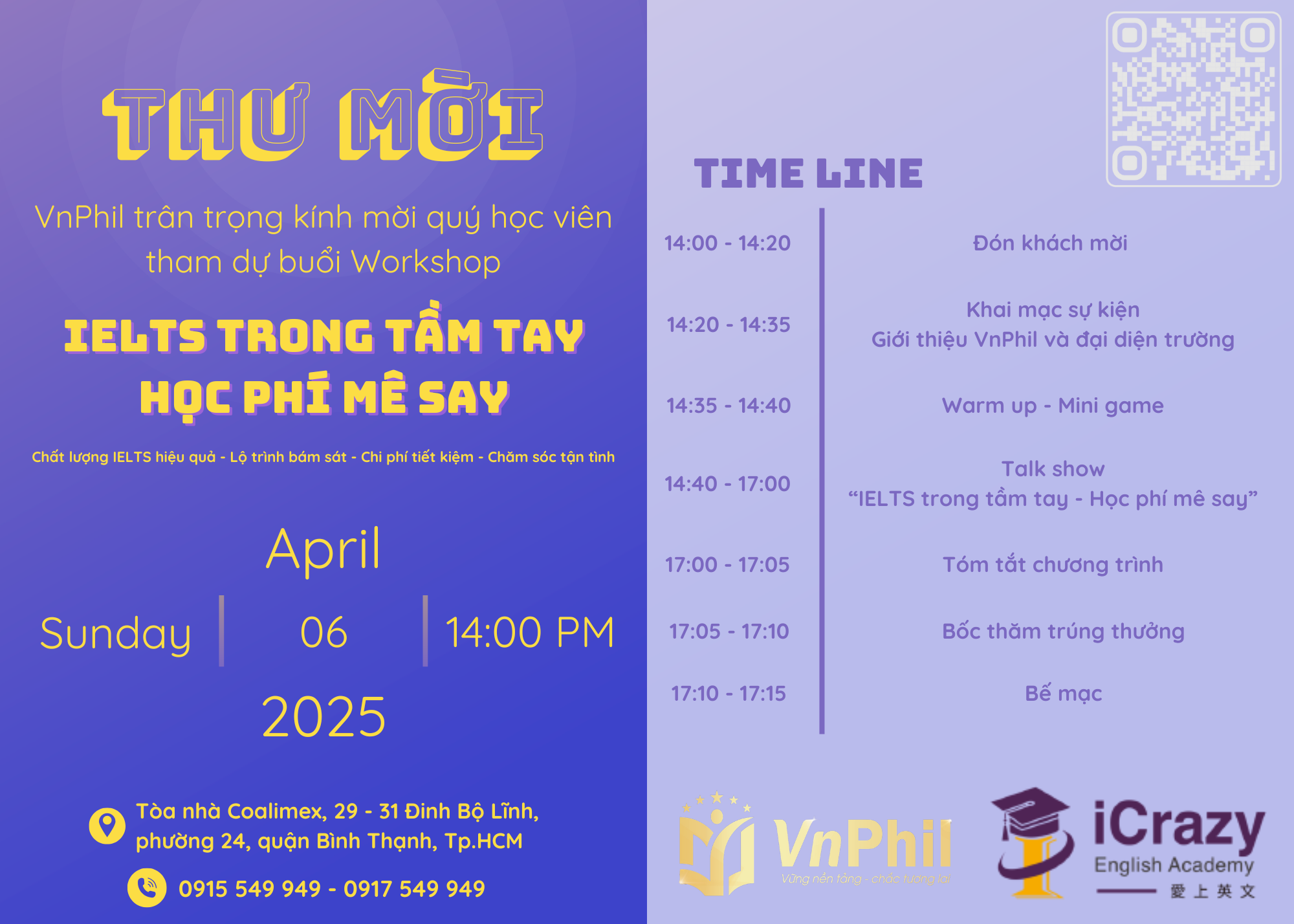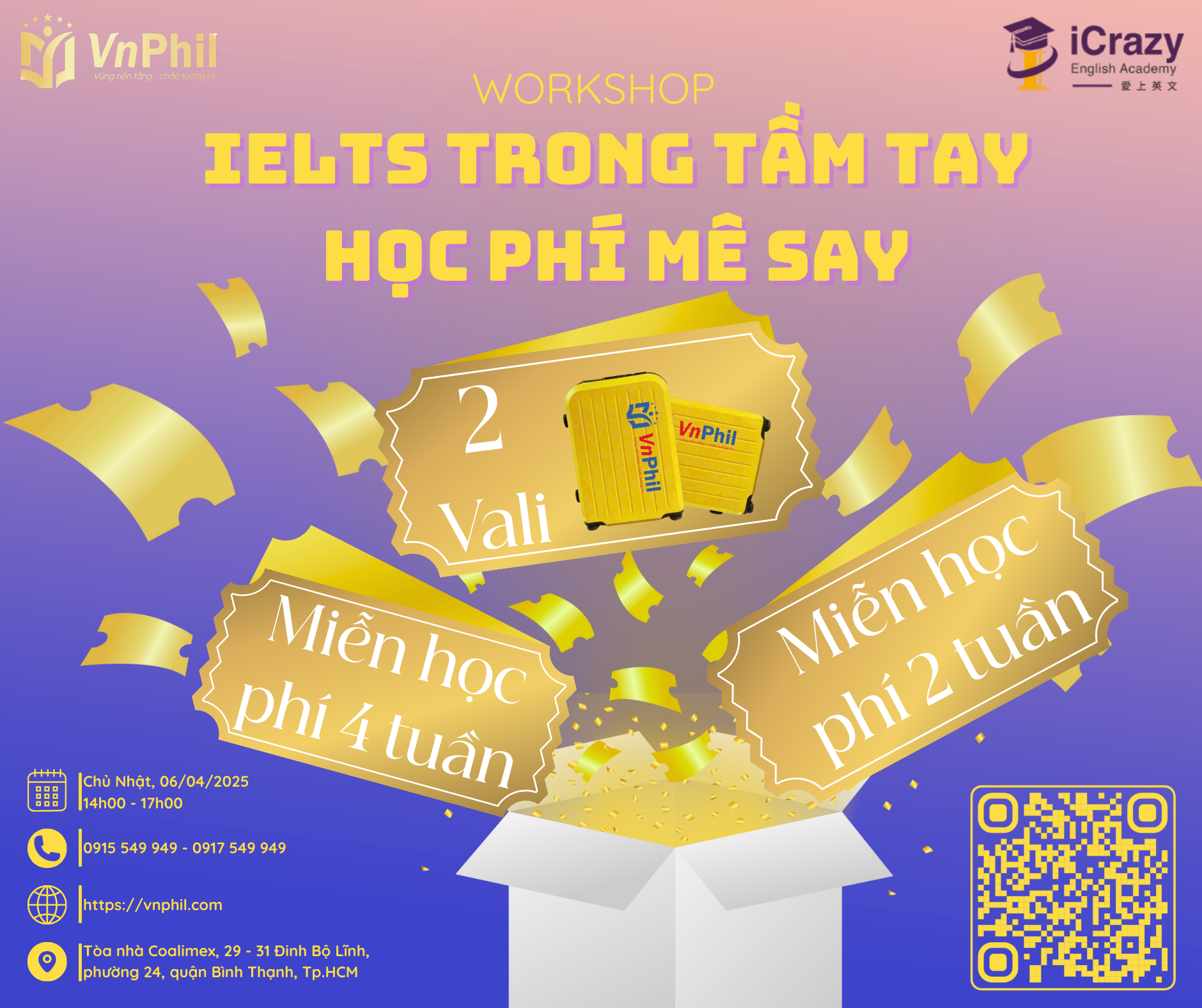 🌟 IELTS không còn là giấc mơ xa vời – Hãy để ICrazy và VnPhil giúp bạn chinh phục mục tiêu nhanh chóng và tiết kiệm nhất! Hẹn gặp bạn tại hội thảo "IELTS trong tầm tay, học phí mê say"!