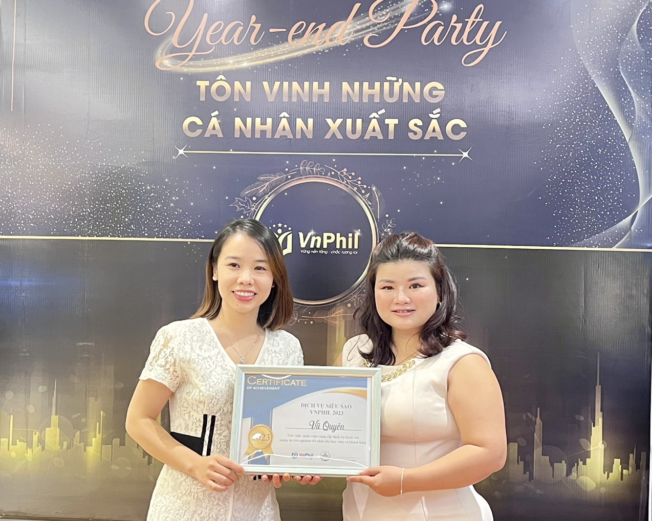 (Trao tặng bằng khen - Ms. Vũ Quyên với giải Dịch vụ Siêu sao Vnphil 2023 - Người đã luôn hết mình hỗ trợ đồng hành và bảo vệ quyền lợi của học viên.)
