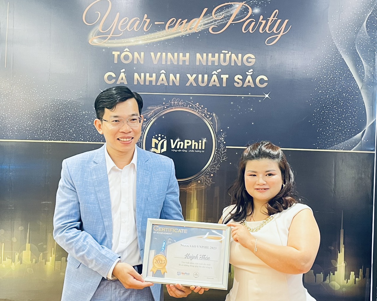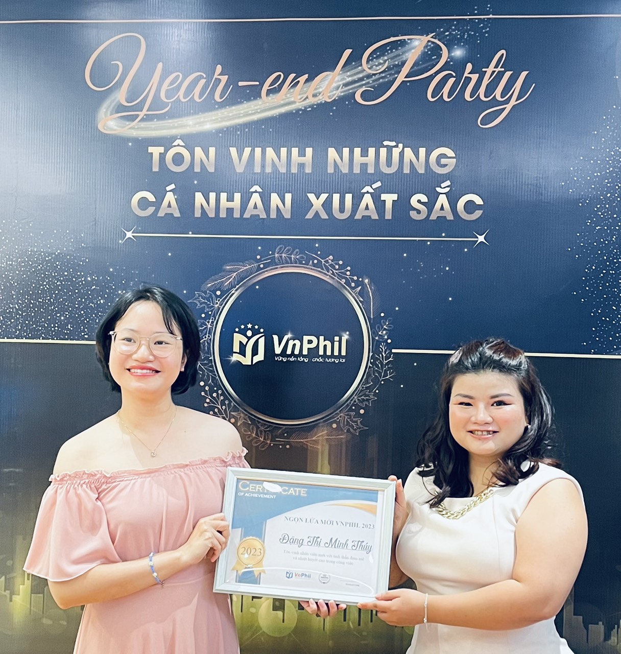 (Trao tặng bằng khen Ms. Minh Thúy với giải ngọn lửa mới Vnphil 2023 - đã luôn nhiệt huyết và có hiệu quả cao trong công việc)
