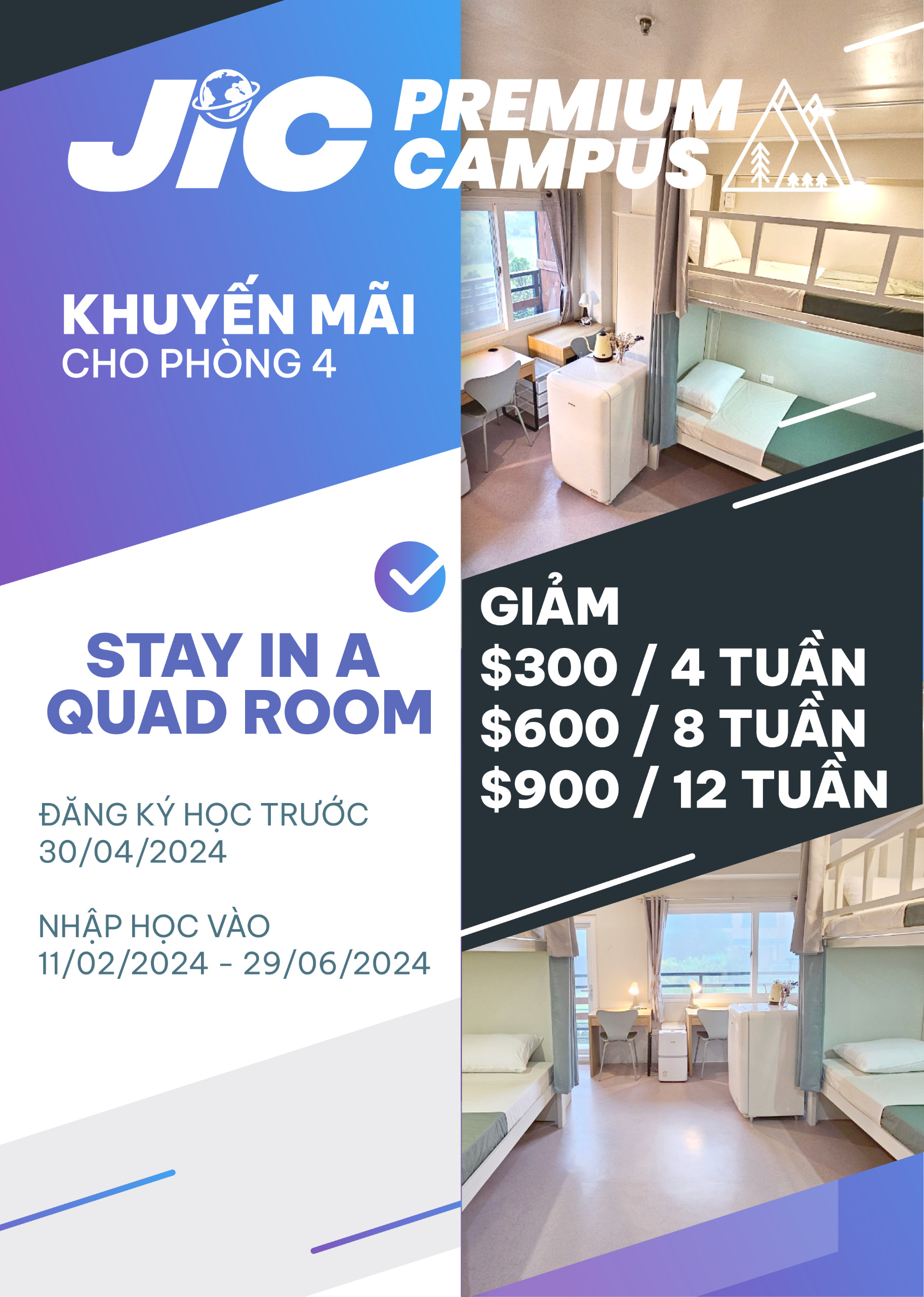 - Đối với KTX phòng 4: Giảm 300USD cho mỗi 4 tuần nhập học