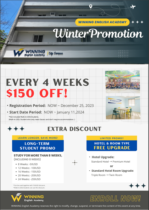 Với thế mạnh là các khóa học tiếng Anh giao tiếp, tiếng Anh tổng quát, tiếng Anh chuyên ngành như hướng dẫn viên du lịch, thương mại,... học viện Anh ngữ Winning English tại Philippines đã nâng cấp cơ sở vật chất trong năm 2023 và dành tặng chương trình học bổng hấp dẫn vào mùa Đông Xuân này.