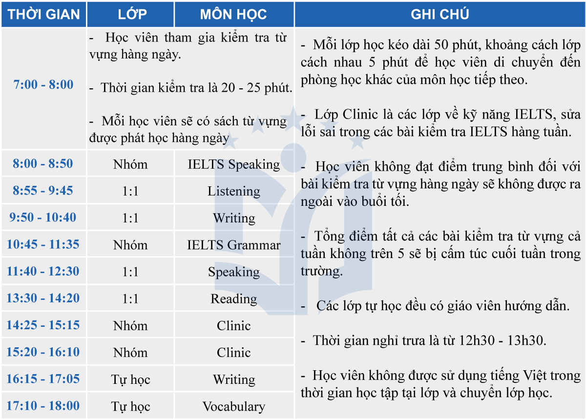 1. Thời gian biểu của khóa học IELTS tại trường Anh ngữ CIA