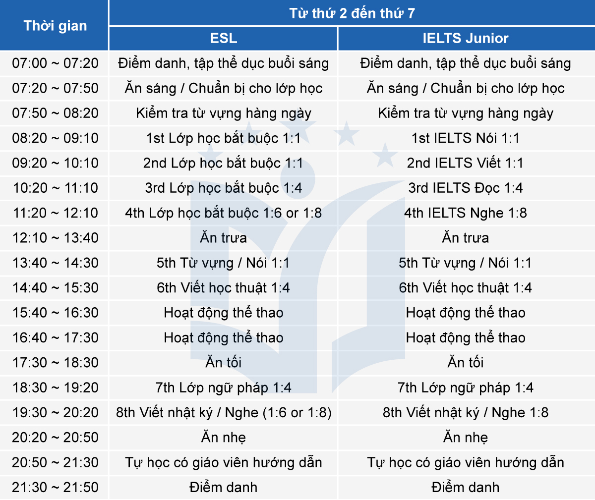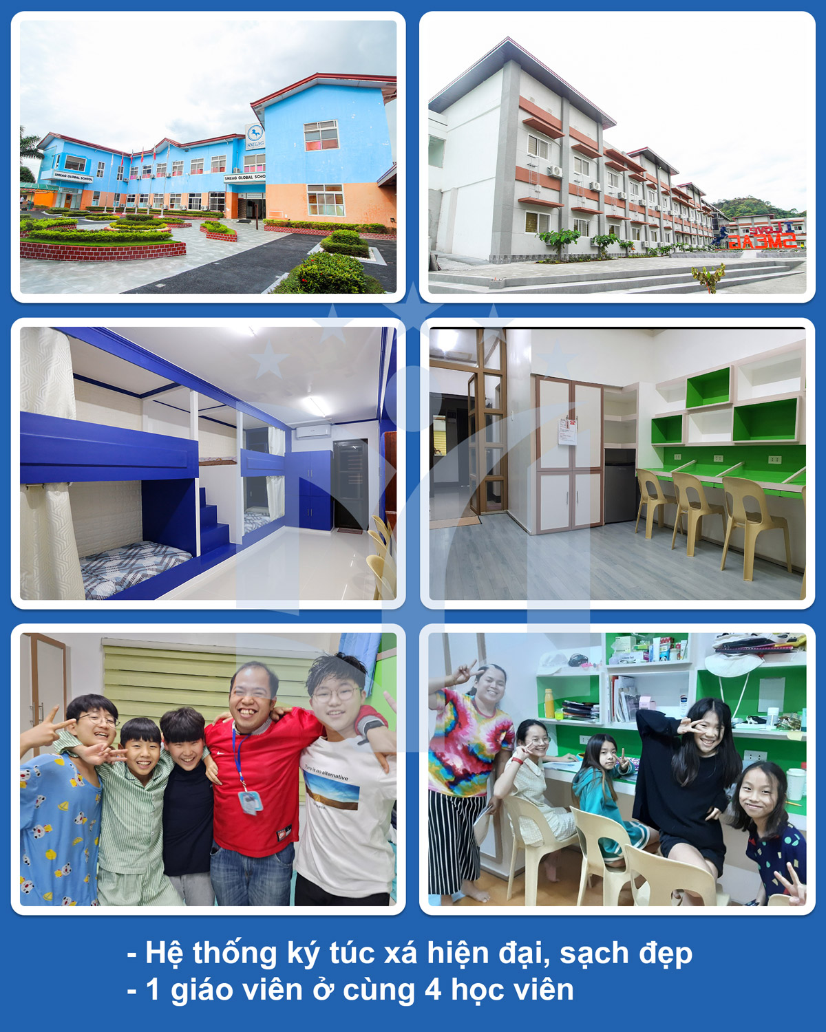 - 1 giáo viên ở cùng 4 học viên/ phòng ký túc xá.