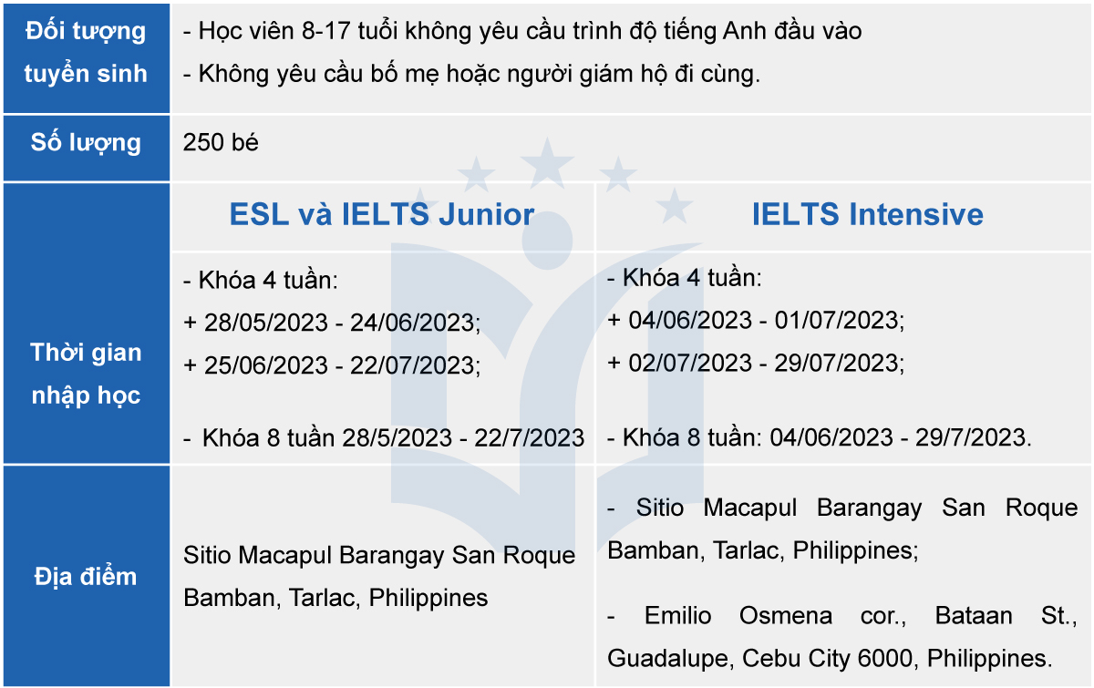 Với chương trình trại hè ESL, IELTS Junior và IELTS Intensive các bé sẽ học tại cơ sở Global School và có nhân viên trường dẫn đoàn. Cơ sở Capital ở Cebu chỉ có chương trình IELTS intensive và không có nhân viên dẫn đoàn.