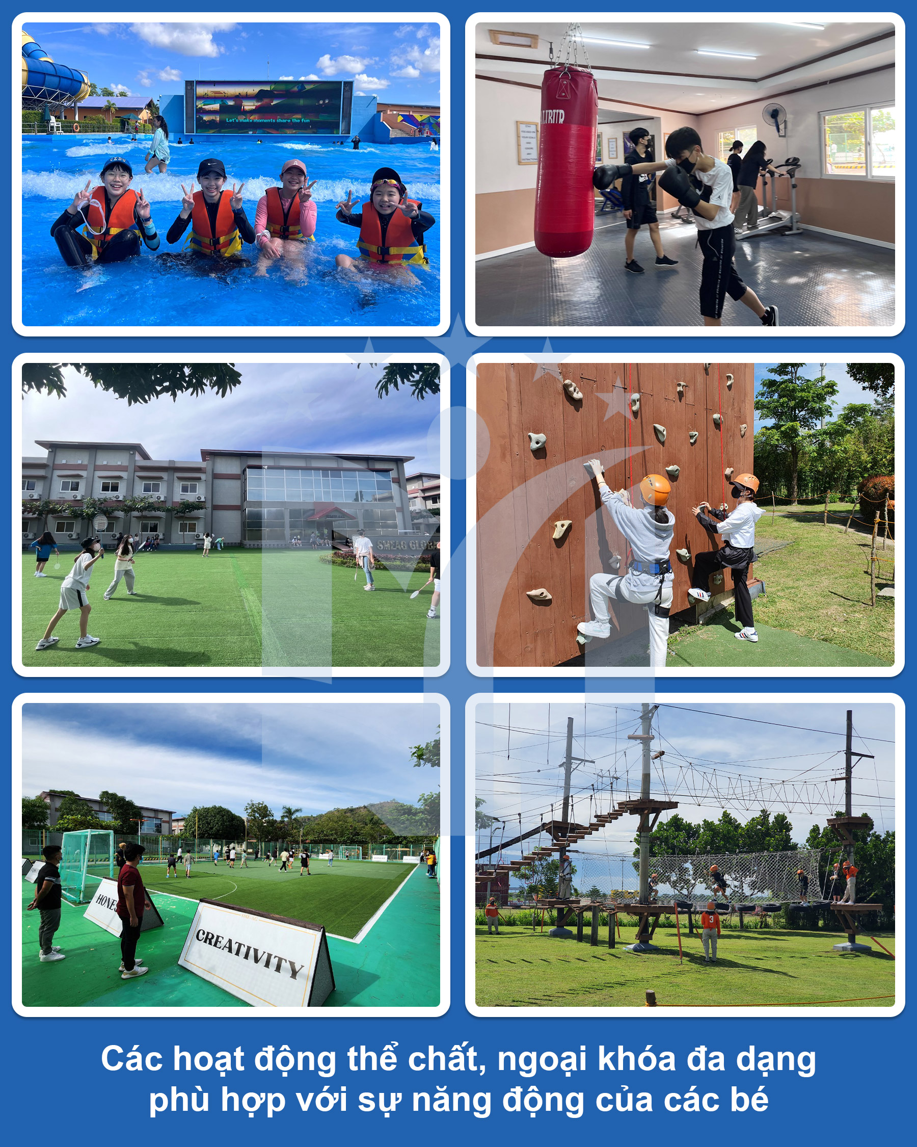 Trong khuôn viên trường: Trong tuần, ngoài giờ học chính khóa, các bé sẽ tham gia các hoạt động phát triển kỹ năng: thi hùng biện, thi tài năng, hoạt động thể thao, cuộc đua kỳ thú…