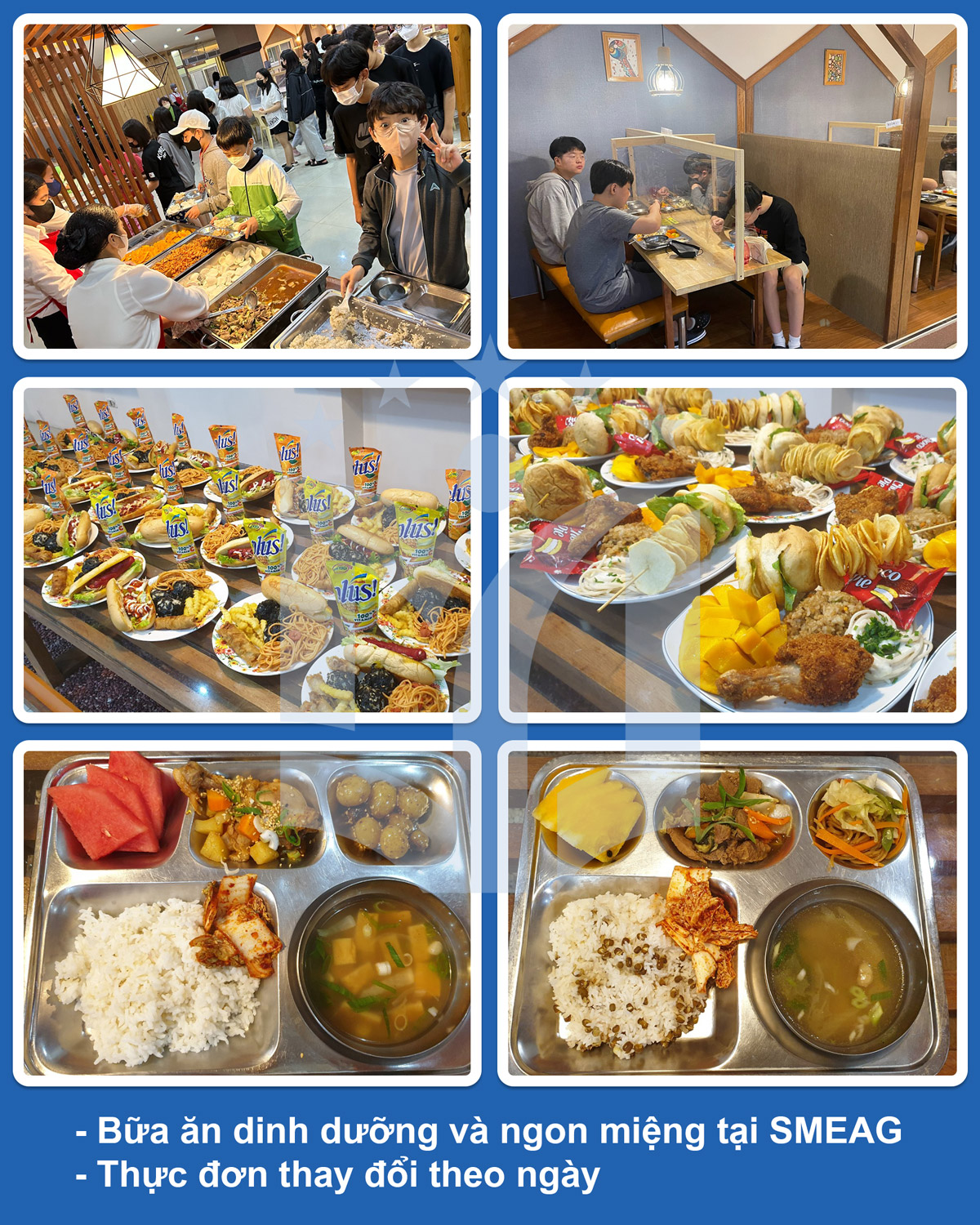 SMEAG cung cấp đa dạng các bữa ăn, phù hợp với mọi lứa tuổi và đảm bảo đầy đủ dinh dưỡng cho sự phát triển của học viên, thực đơn thay đổi theo ngày có sự kết hợp giữa món Việt, Hàn, Nhật…