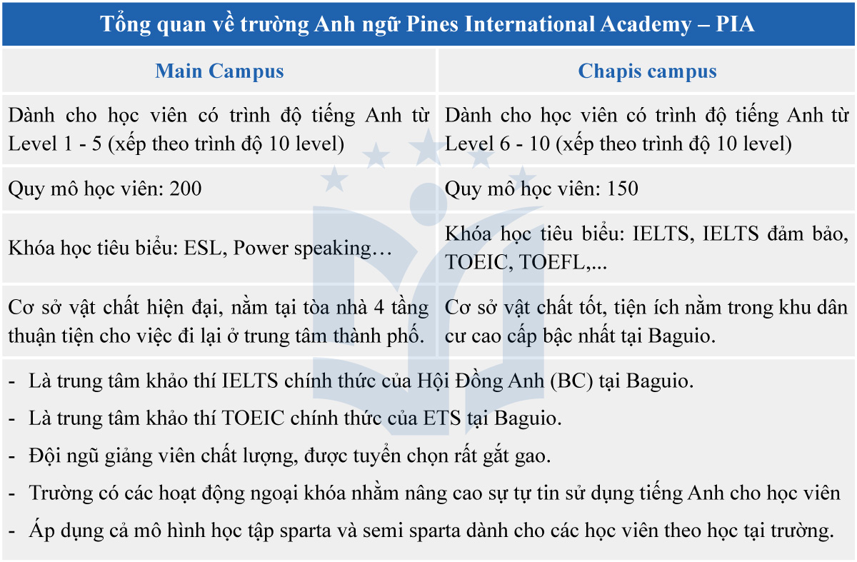 Được thành lập từ năm 2002 tại thành phố Baguio, Học viện Anh ngữ PINES (Pines International Academy – PIA) đã và đang là điểm đến yêu thích của nhiều thế hệ học viên Châu Á bởi mô hình giảng dạy tiếng Anh hiệu quả, cơ sở vật chất hiện đại cũng như thời gian và chi phí luôn được tối ưu.