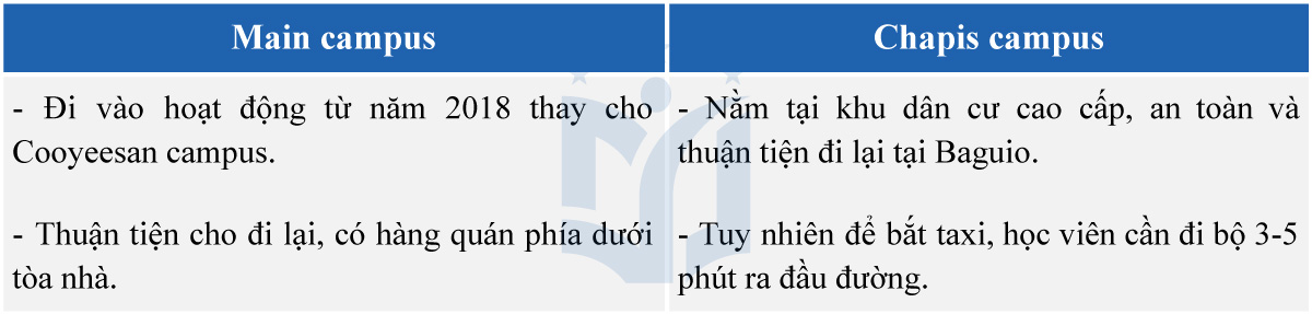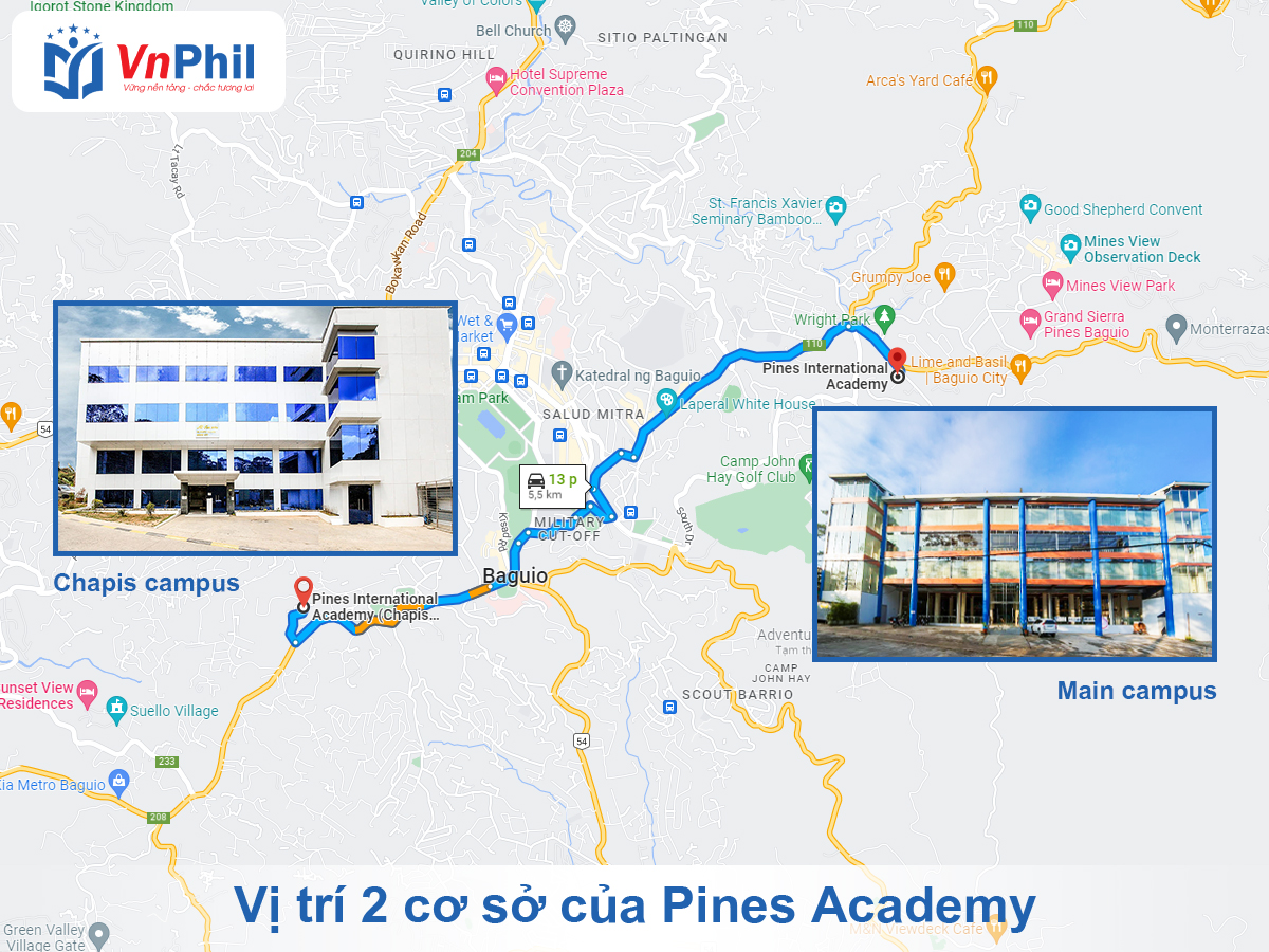 Nhằm tập trung chuyên môn hóa các chương trình học và hỗ trợ học viên tối ưu nhất, Pines có 2 cơ sở giảng dạy chuyên biệt là Main campus và Chapis campus cách nhau khoảng 10 phút đi xe.