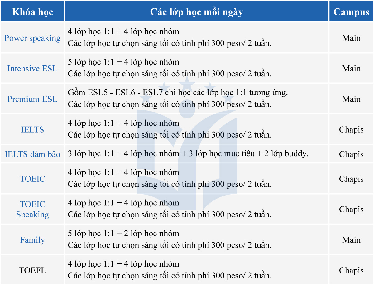 + Học viên có 3 lớp học mục tiêu mỗi ngày là các lớp học có giáo viên hướng dẫn đặt ra các đề mục yêu cầu về các kỹ năng tiếng Anh.