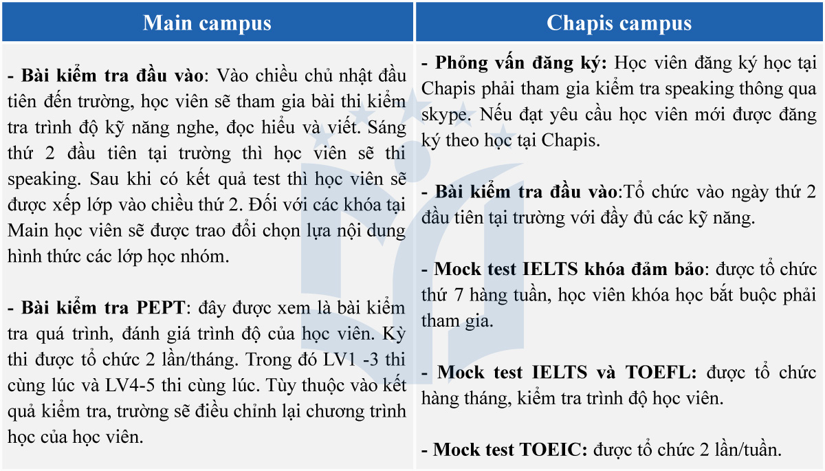 + Học viên phải tham gia và vượt qua kỳ thi phỏng vấn đăng ký học tại Chapis mới được theo học chương trình IELTS đảm bảo.