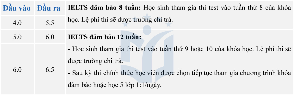 + Khi không đạt điểm số cam kết, học viên sẽ được tiếp tục học miễn học phí tại trường cho đến khi đạt được điểm số IELTS như cam kết (không bao gồm chi phí ăn ở và chi phí địa phương).
