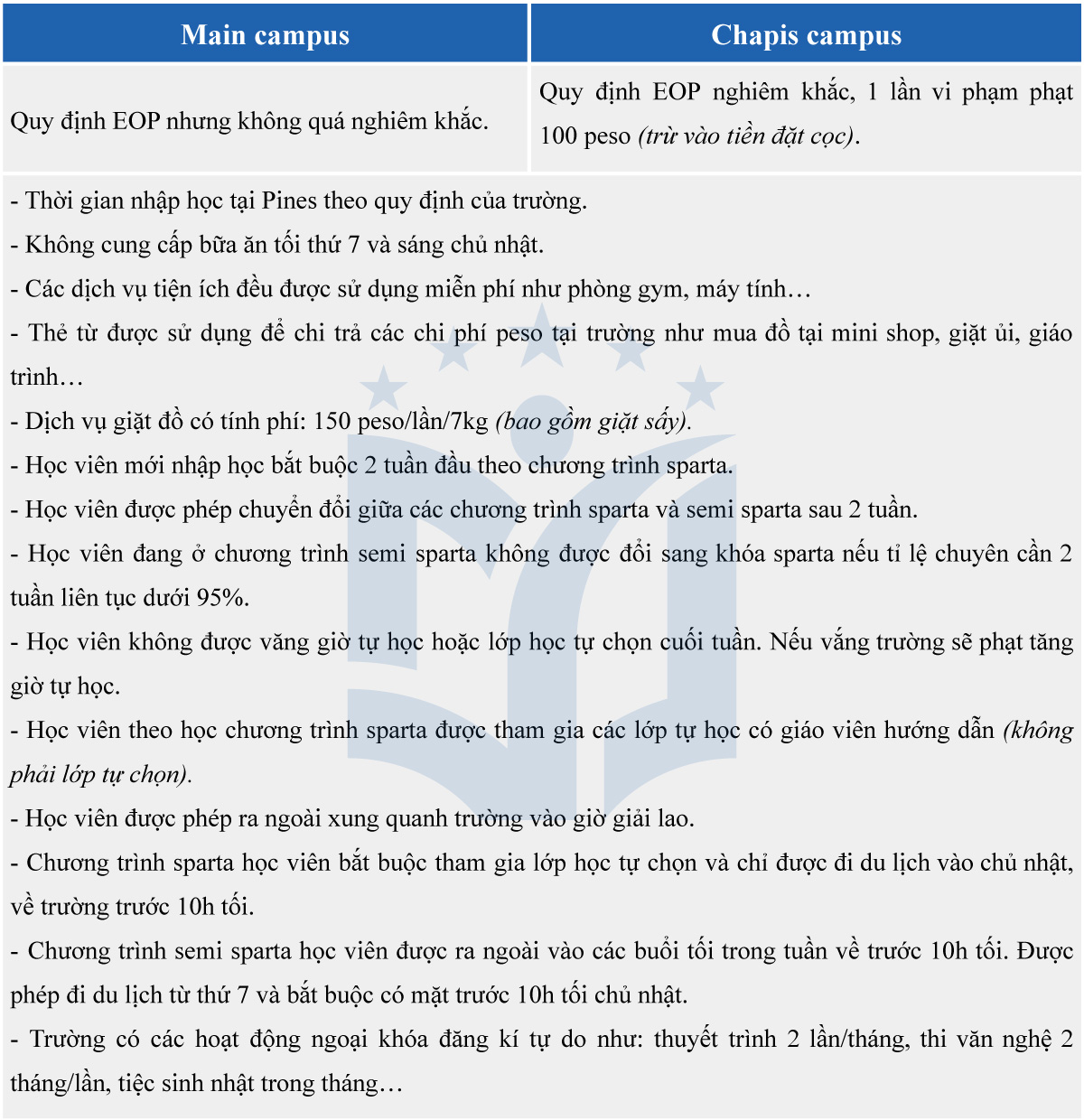 - Theo sát học viên trong suốt thời gian học tập tại Philippines nhằm hỗ trợ học viên có thời gian học tập thoải mái hiệu quả nhất có thể.